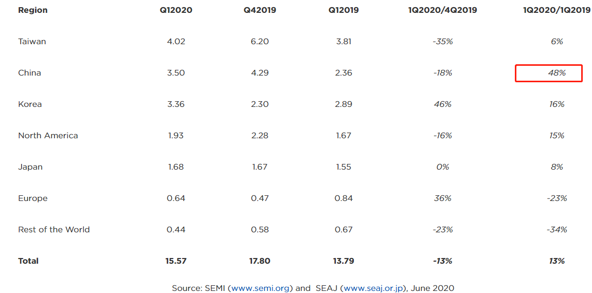 半導(dǎo)體產(chǎn)業(yè)協(xié)會(SEMI)的數(shù)據(jù)顯示 ,新冠疫情開始爆發(fā)的一季度,半導(dǎo)體銷售額同比增長13%;在主要經(jīng)濟體中,同比增幅較大的是中國(48%)。